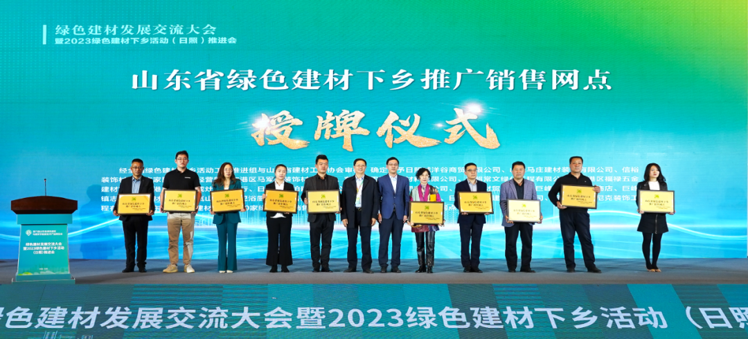 經(jīng)全國(guó)綠色建材下鄉(xiāng)活動(dòng)工作推進(jìn)組與山東省建材工業(yè)協(xié)會(huì)審核,確定授予日照誠(chéng)洋谷商貿(mào)有限公司等20家綠色建材銷售商“山東省綠色建材下鄉(xiāng)推廣銷售網(wǎng)點(diǎn)”稱號(hào),中國(guó)建材工業(yè)經(jīng)濟(jì)研究會(huì)秘書長(zhǎng)、中國(guó)建筑材料工業(yè)規(guī)劃研究院副院長(zhǎng)王剛,山東省建材工業(yè)協(xié)會(huì)會(huì)長(zhǎng)、山東省建筑材料工業(yè)設(shè)計(jì)研究院院長(zhǎng)靳志剛為獲得“山東省綠色建材下鄉(xiāng)推廣銷售網(wǎng)點(diǎn)”的銷售商授牌。