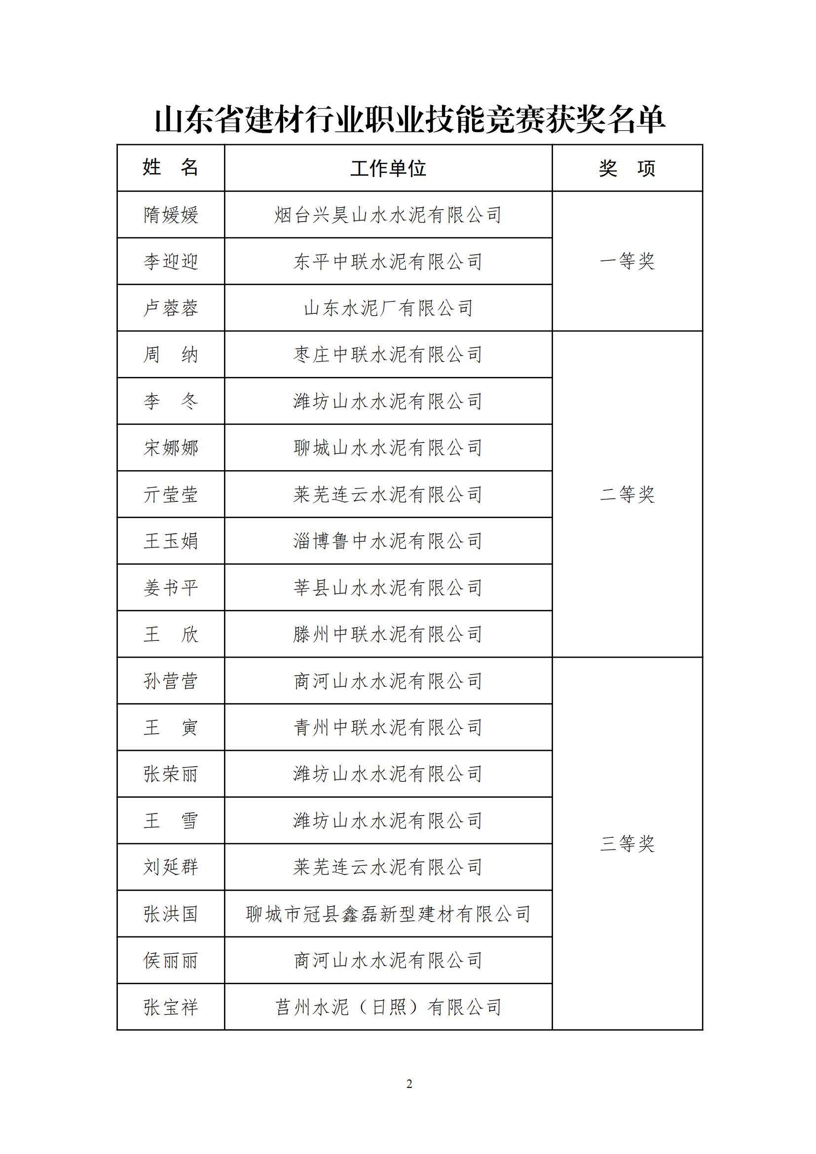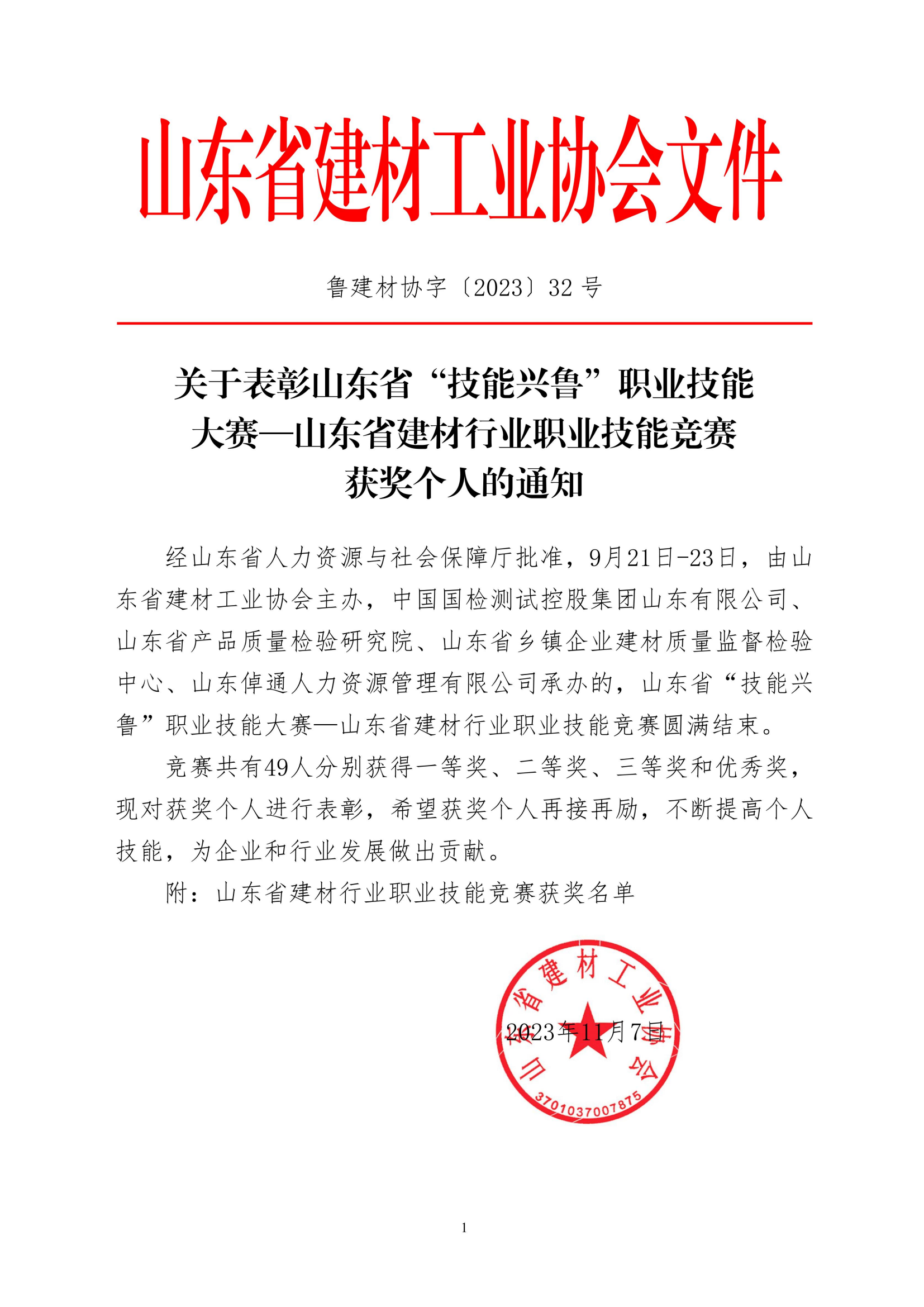 關于表彰山東省“技能興魯”職業技能大賽—山東省建材行業職業技能競賽獲獎個人的通知