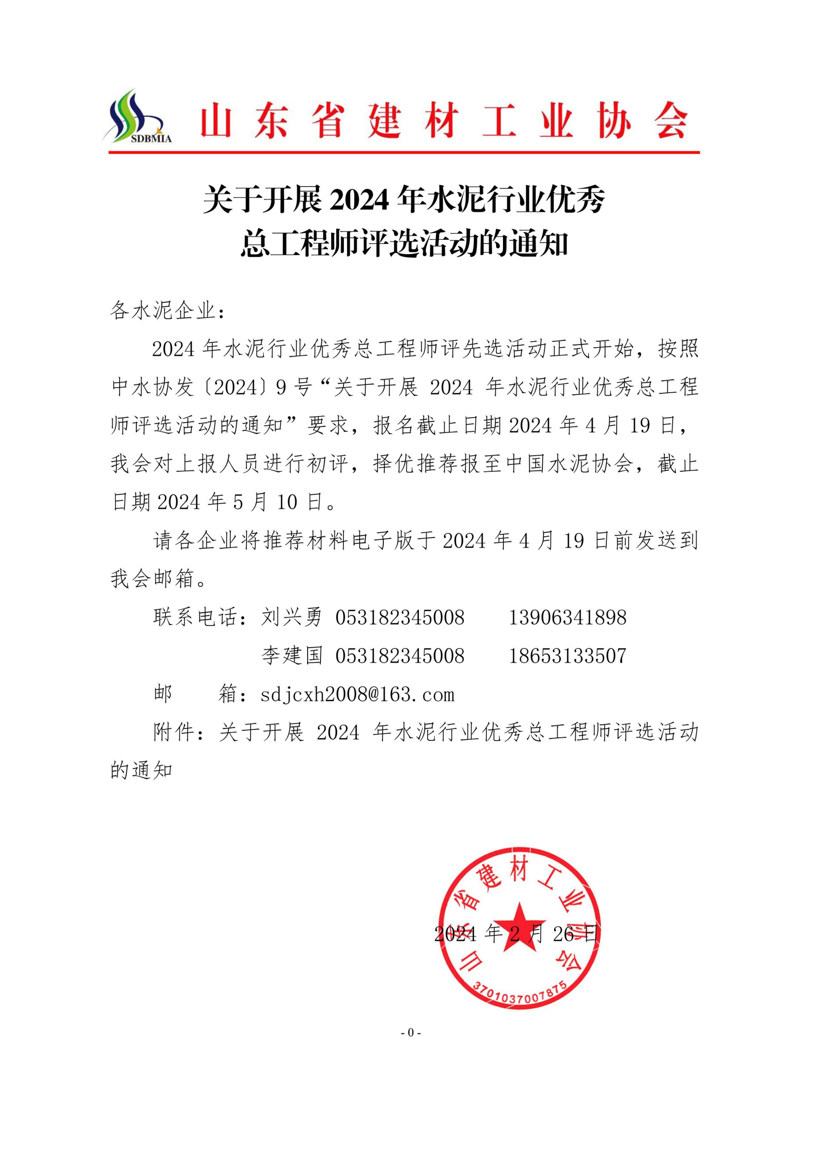 山東省建材工業協會關于開展2024 年水泥行業優秀總工程師評選活動的通知