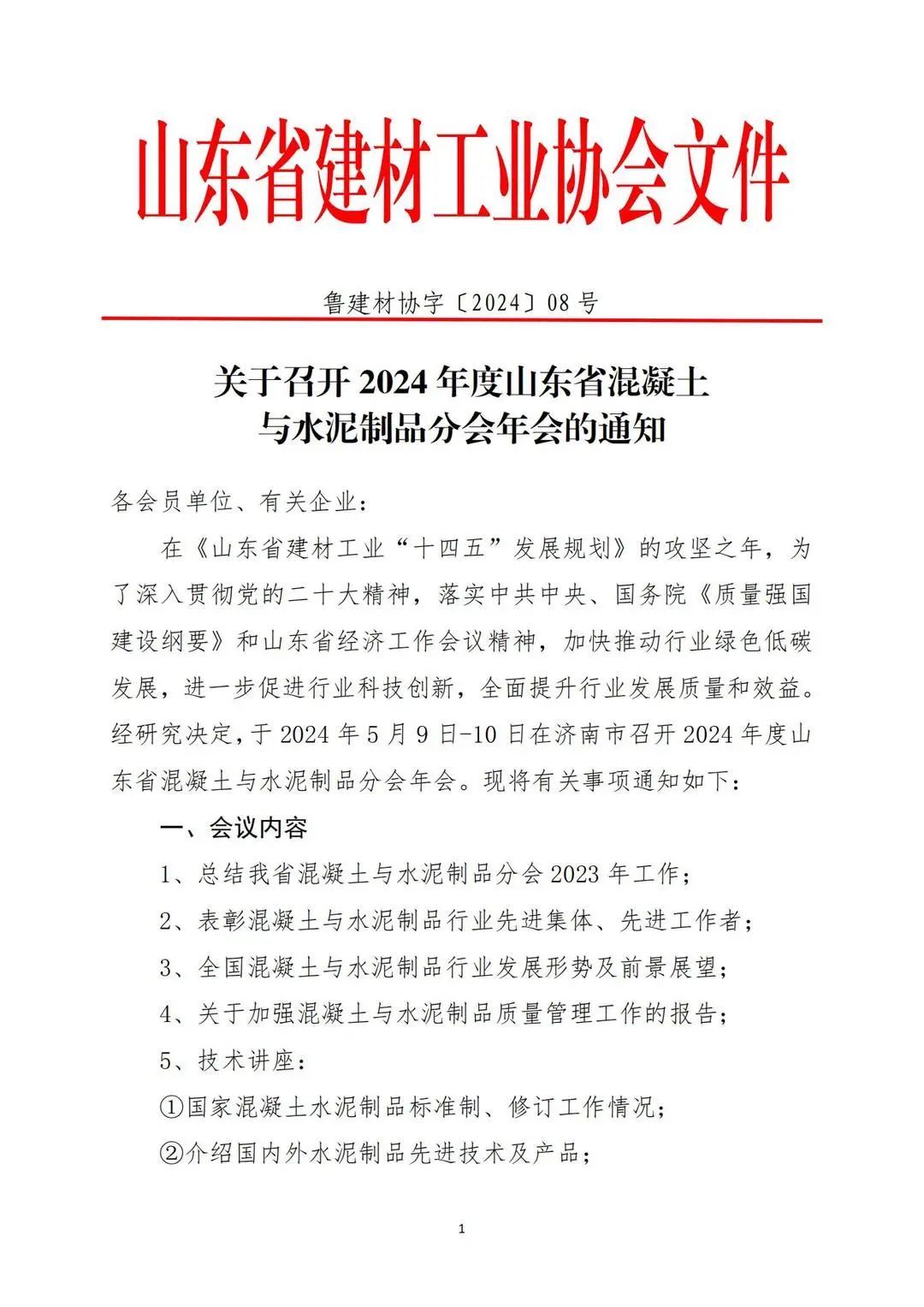 山東省建材工業協會關于召開2024年度山東省混凝土與水泥制品分會年會的通知