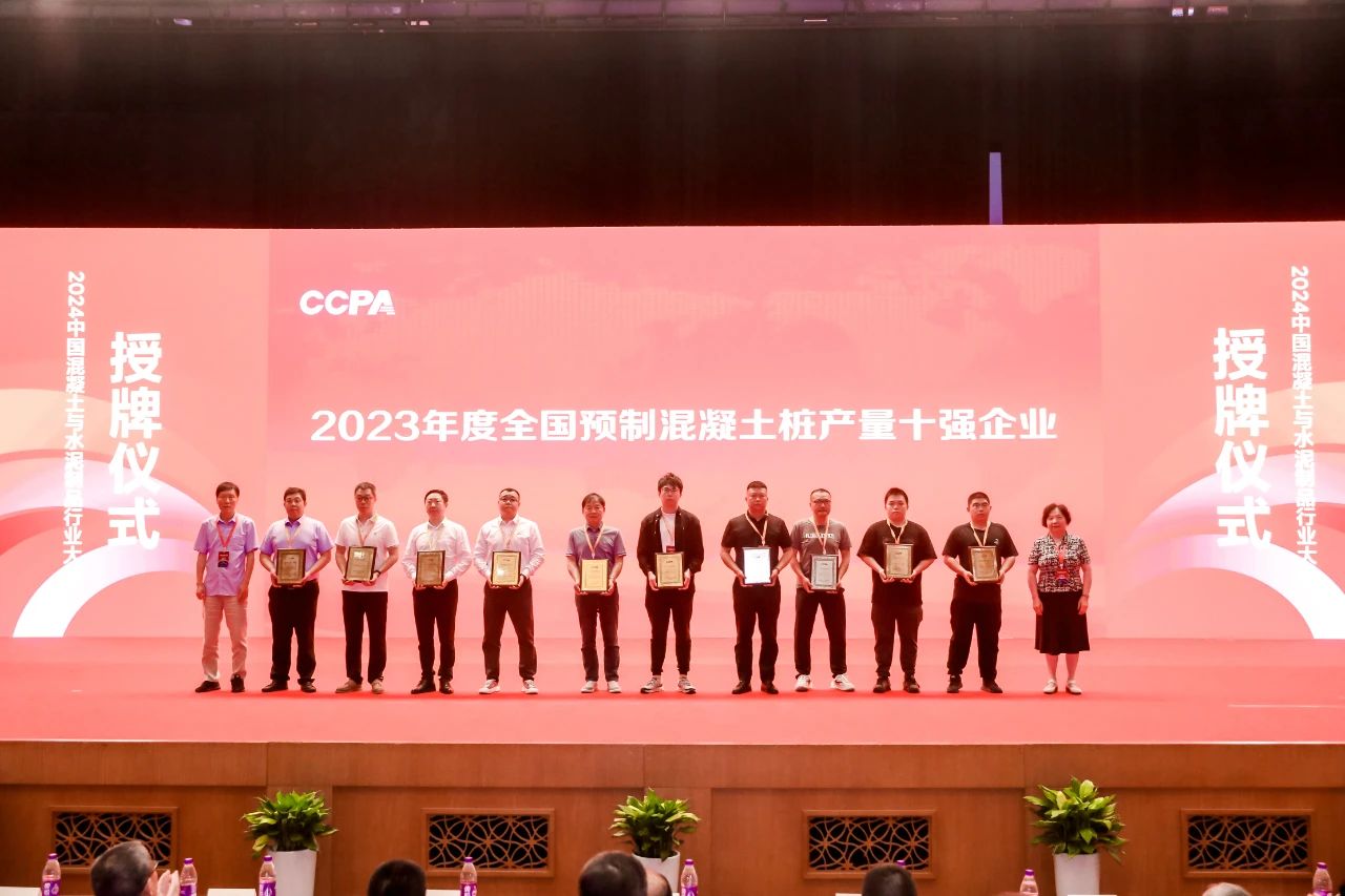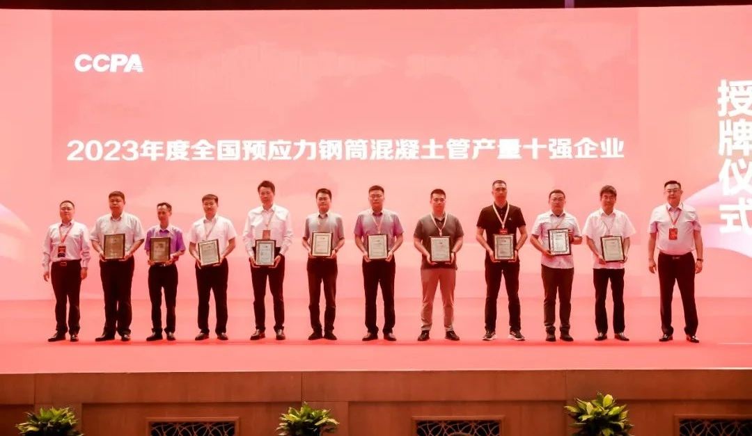 中國混凝土與水泥制品協會秘書處在對預拌混凝土、預制混凝土構件、預制混凝土樁、預應力鋼筒混凝土管四個行業重點企業進行調研和統計分析的基礎上,以產量為基礎發布了2023年度十強企業名單,并進行授牌。其中我會理事單位獲獎企業有山東龍泉管業股份有限公司、中國電建集團山東電力管道有限公司、山東禹王管業有限公司、青島中禹管業有限公司、山東沃特管業股份有限公司。