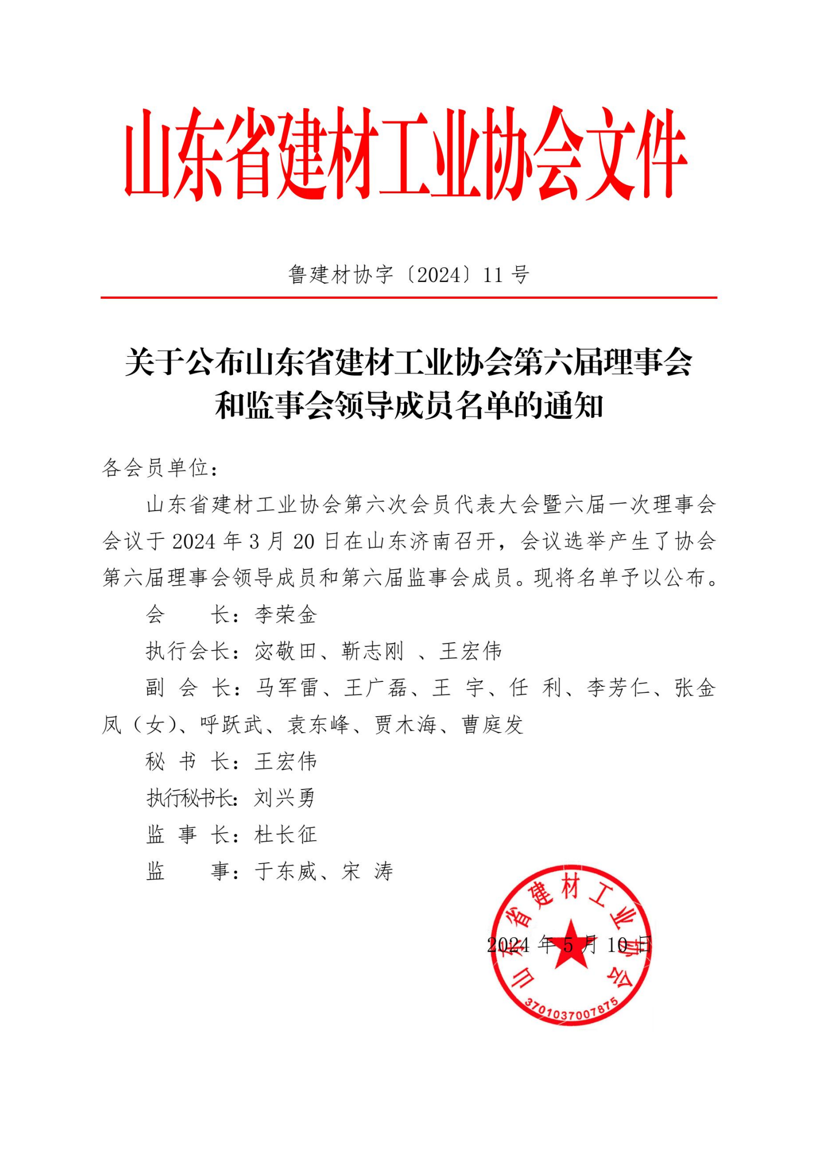 關于公布山東省建材工業協會第六屆理事會和監事會領導成員名單的通知