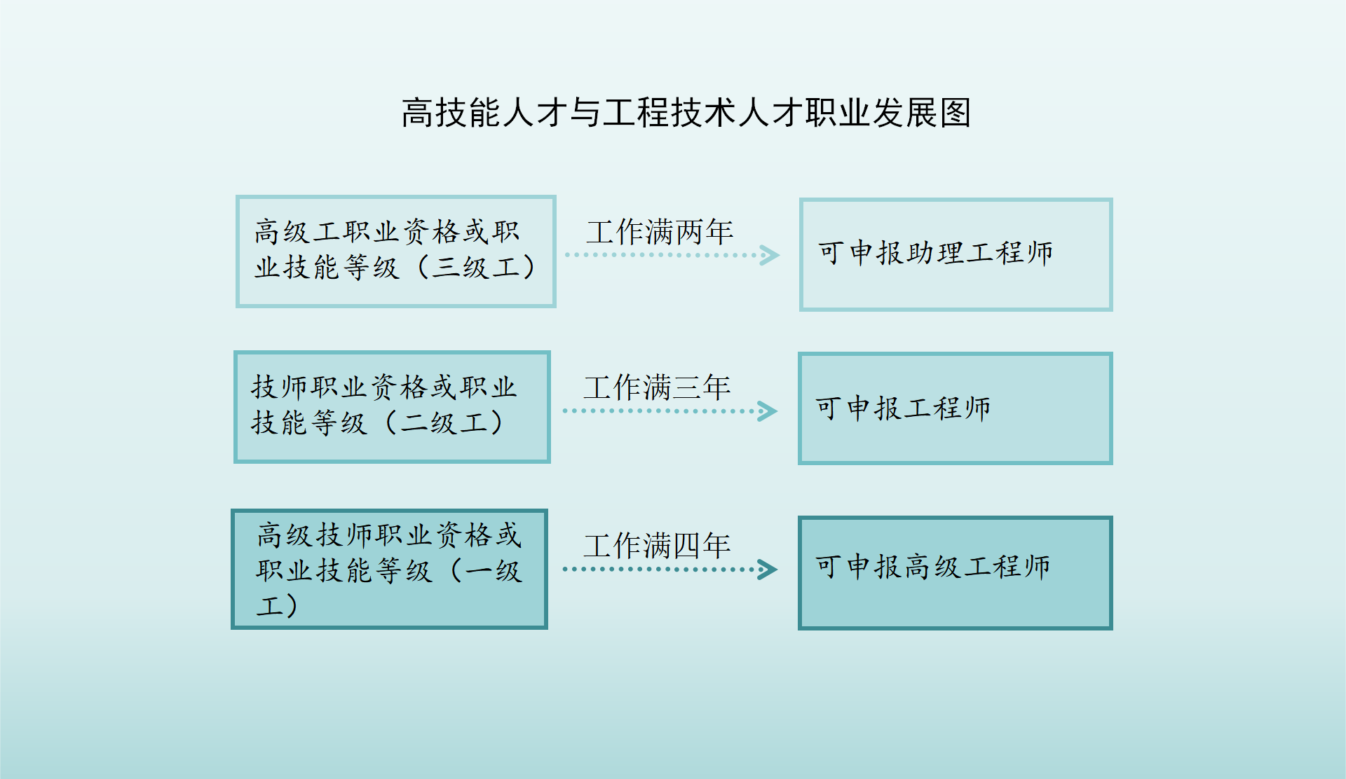 獲得高級工職業資格或職業技能等級后從事技術技能工作滿2年,可申報評審相應專業助理工程師;獲得技師職業資格或職業技能等級后從事技術技能工作滿3年,可申報評審相應專業工程師;獲得高級技師職業資格或職業技能等級后從事技術技能工作滿4年,可申報評審相應專業高級工程師。